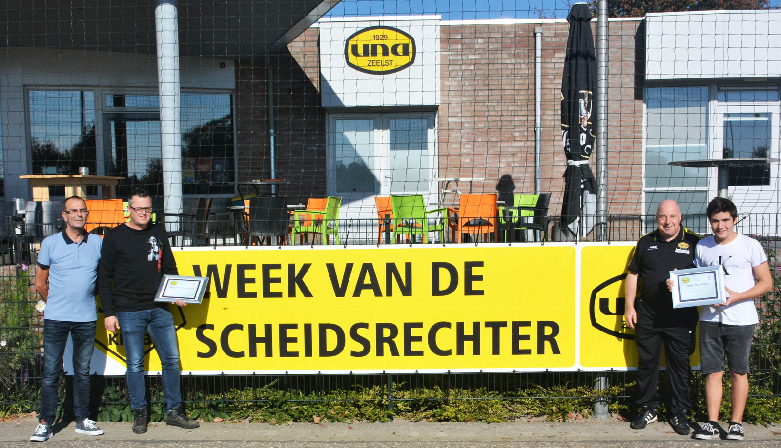 Incidenten rond clubscheidsrechters komen amper voor op het complex van UNA, verzekert de voorzitter van de arbitragecommissie: “Die zijn per seizoen op de vingers van een hand te tellen. En gelukkig blijft dat dan beperkt tot verbaal geweld. Spelers die over de schreef gaan worden aangesproken op hun gedrag. Zo nodig volgen er sancties in de vorm van een schorsing voor één of meer weken of een taakstraf. Zoals het schoonmaken van de kleedkamers of een training verzorgen voor de jongste spelertjes. Dat werkt heel effectief.”