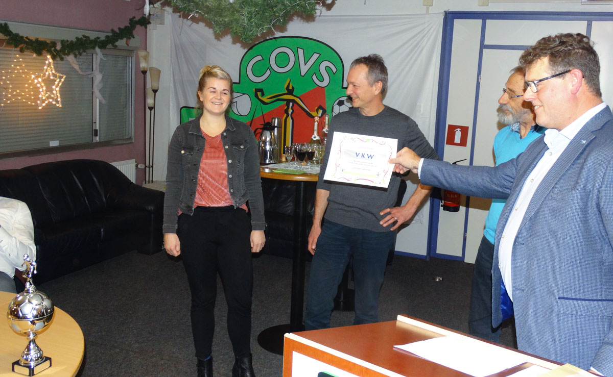 Uit handen van Theo Hein (rechts) van scheidsrechtersvereniging HZOD ontvangt de vertegenwoordiger van VKW de Fair Play-bokaal 2018. De zondag 1e klasser uit Westerbork verzamelde afgelopen jaar het minst aantal gele en rode kaarten.