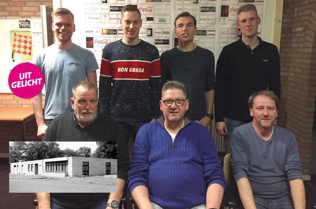 Het huidige bestuur met boven v.l.n.r. Remco Hoffmann, Marco Ribbink, Teun van der Velden, Joshua Kuipers en onder v.l.n.r. Arnold Spin, Hans Reefman, Bart Lagerwaard. Linksonder het huidige clubgebouw De Tijplaats.