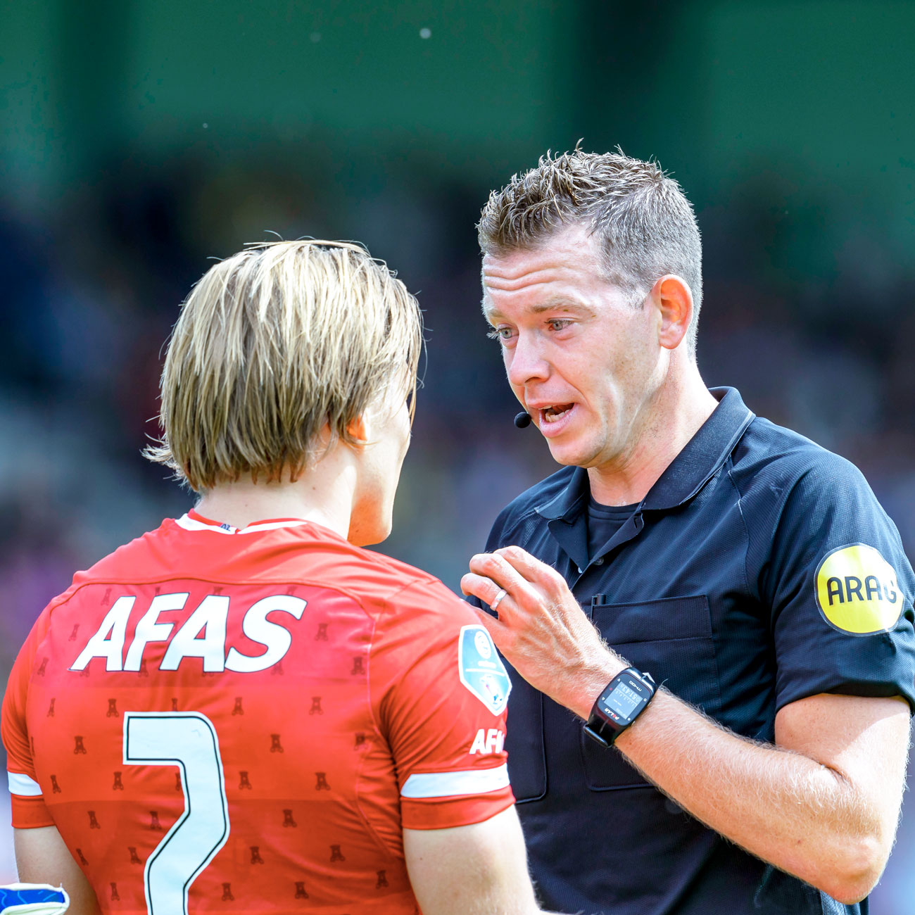 Allard Lindhout in gesprek met een speler van AZ. Foto Pro Shots / Marcel van Dorst.